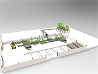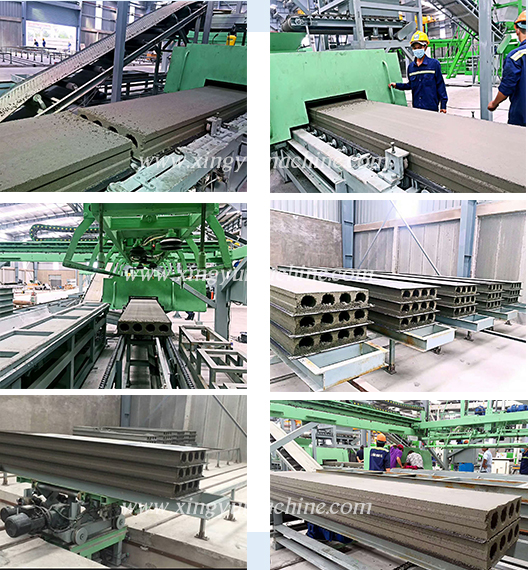 該生產線由專有模具設計,自動計量配料、密封輸送、連續干混、強制濕混、托板自動上板、板料輸送、高性能連續擠出、成型控制、伺服同步追蹤、自動切割、質量在線視覺分析,自動碼垛,叉車運轉,自動養護,溫濕度控制、自動成品拆模,中央總控計算機系統,等主要部分組成。